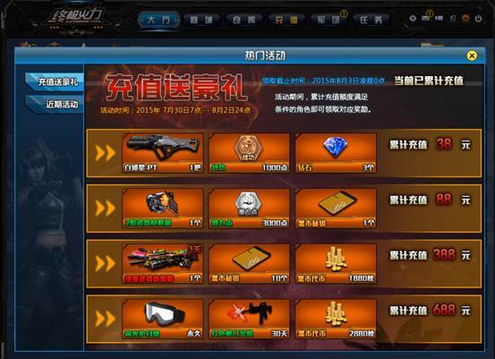 如期小编如约而至,《终极火力》在29日版本更新维护后,将为各位战友送上充值送好礼活动,充值累计后战友们可直接兑换奖励,除钻石、黑市代币奖励外还有全新成长武器白矮星-PT及闪光护目镜哦。。先睹为快吧。。