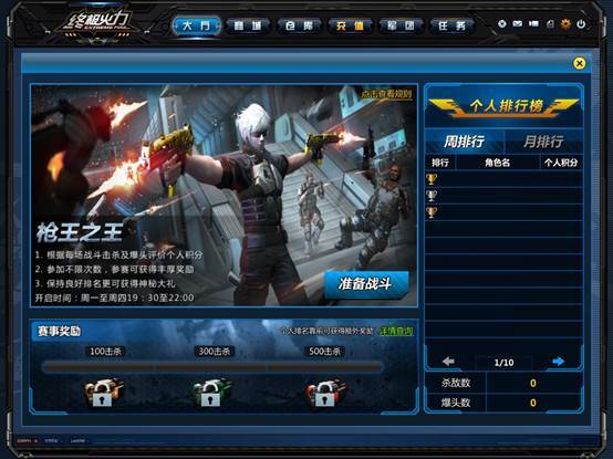 功能描述: 周期性个人赛事,比赛模式为个人战。玩家可通过参加枪王之王赛事获得枪王之王积分,提升自己的排名。参加枪王之王的玩家每周都可以获得枪王之王专属奖励,排名靠前的玩家可获得专属勋章和丰厚排名奖励